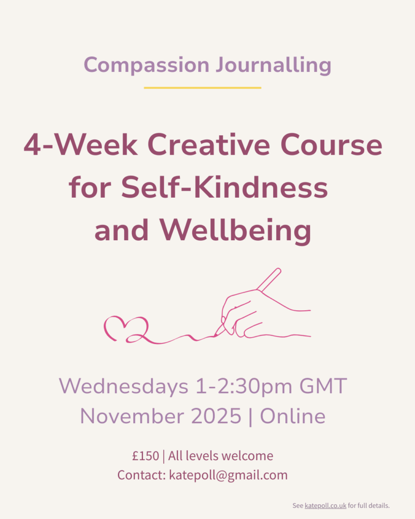 Facilitator: Kate Poll – MSc Creative Writing for Therapeutic Purposes, specialising in creative facilitation and reflective wellbeing practices. Author of ‘Writing myself back’ (Lapidus Magazine, Issue Six).